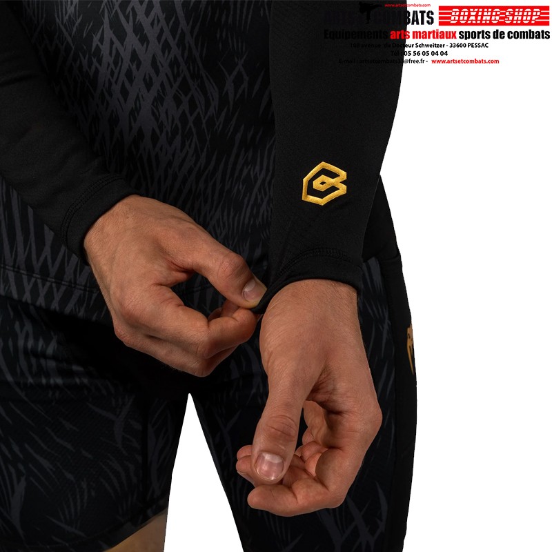 Le design de ce rashguard présente des graphismes sublimés noirs et gris élégants qui évoquent la fourrure du loup. Des touches dorées de co-branding soulignent la puissance de cette collaboration MMA.