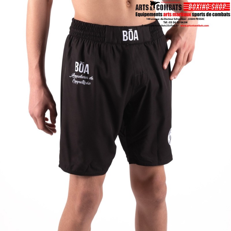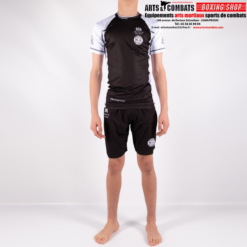 Ce modèle arbore un design élégant et agressif, en noir et blanc, reflétant la détermination d'un combattant prêt à tout donner. Les graphismes minimalistes mais percutants, accompagnés du logo "BŌA" sur la cuisse, ajoutent une touche d'authenticité et de flair unique. L'inscription discrète "Armadura de Competição" souligne l'esprit compétitif du produit.