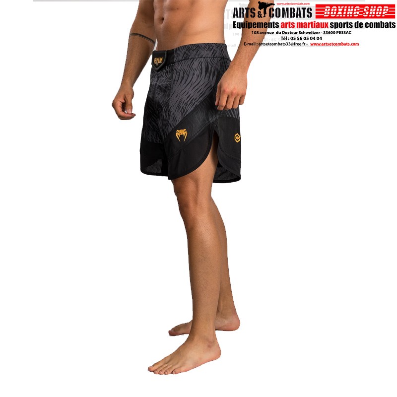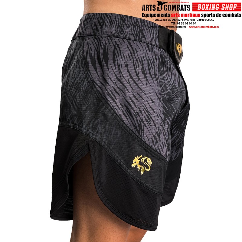 Le design de ce short présente des graphismes sublimés noirs et gris élégants qui évoquent la fourrure du loup. Des touches dorées de co-branding soulignent la puissance de cette collaboration MMA.